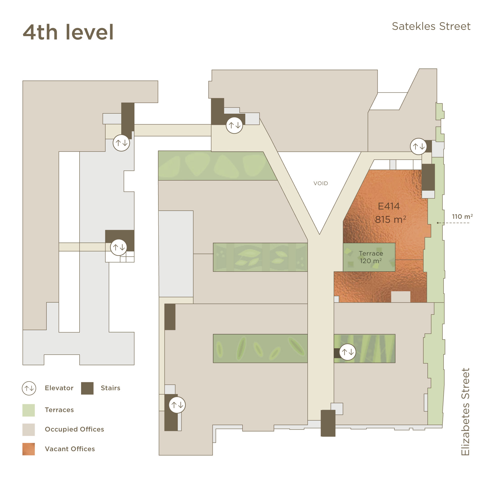 - Terases: Privāta atklātā zaļā terase un plašs balkons, kas vērsts uz Elizabetes ielu, nodrošina darbinieku labsajūtu, samazinot stresu, palielinot produktivitāti un veicinot radošumu.